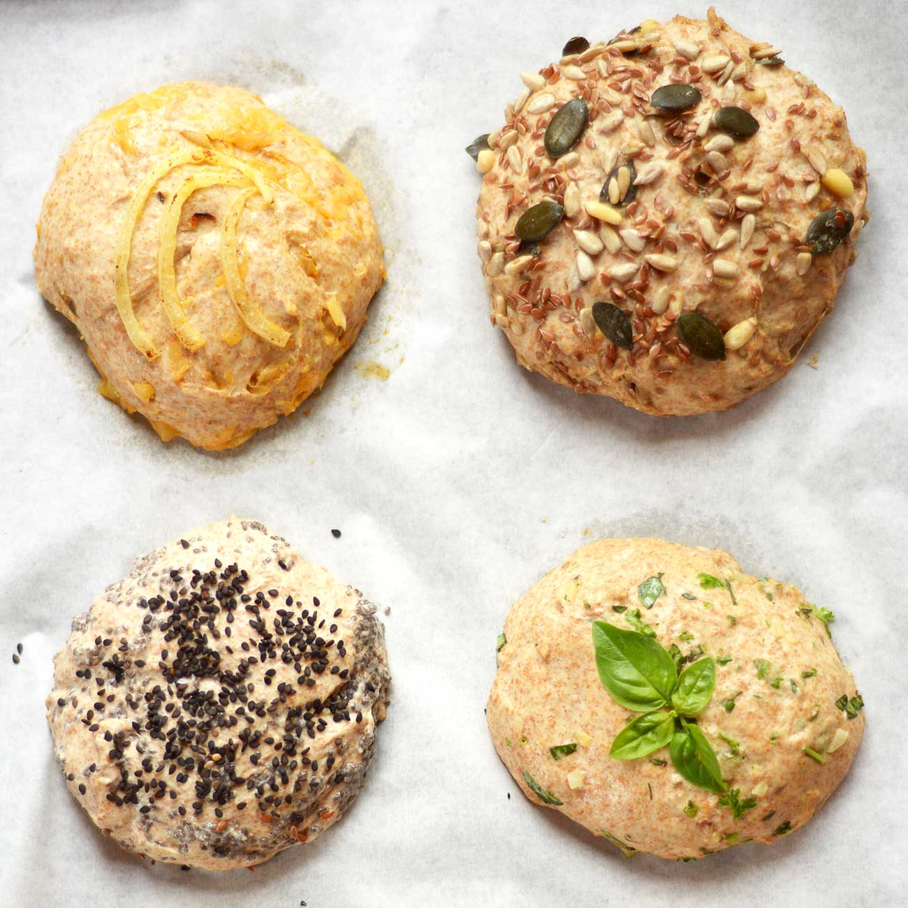 Najprej zmešamo suhe sestavine, dodamo jogurt, mineralno vodo ali pivo in poljubne dodatke ter zamesimo gladko zmes, ki jo razdelimo na 6 – 10 delov in poljubno oblikujemo. Če je zmes preveč lepljiva dodamo še malo moke.